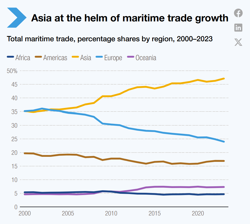 Secondo i recenti dati dell’UN Trade & Development, il trasporto attraverso mari e oceani muove oltre l’80% dei commerci mondiali. Una percentuale cresciuta di pari passo con la crescita degli affari marittimi tra i cosiddetti Paesi in via di sviluppo: oggi si scambiano oltre il 50% delle merci via mare, con l’Asia in testa.